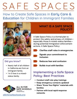 The one-pager “How to Create Safe Spaces in Early Care and Education for Children in Immigrant Families” offers ECE providers a concise, practical guide for implementing safe-space guidance into site policies to support the safety, confidence and well-being of children in immigrant families.