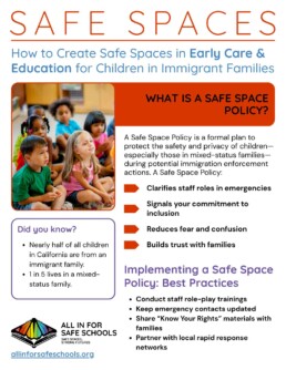 ALL IN for Safe Schools, Bringing Up California, CLASP and the Child Care Law Center created this resource for California’s early care and education providers. The one-pager “How to Create Safe Spaces in Early Care and Education for Children in Immigrant Families” offers ECE providers a concise, practical guide for implementing safe-space guidance into site policies to support the safety, confidence and well-being of children in immigrant families. This fact sheet highlights the rights of ECE sites and the families they serve, and clarifies what immigration agents must show to gain legal access to ECE sites.